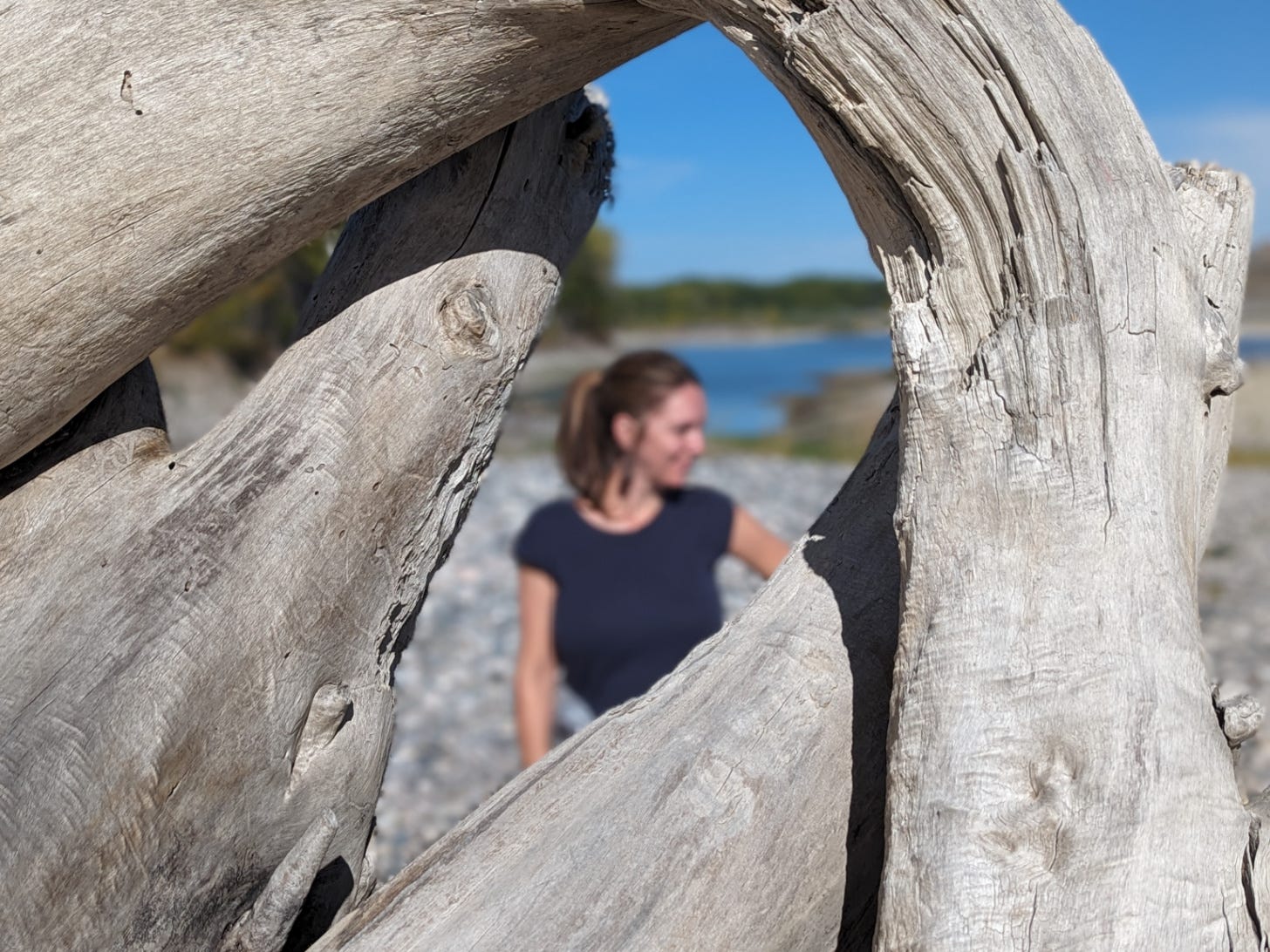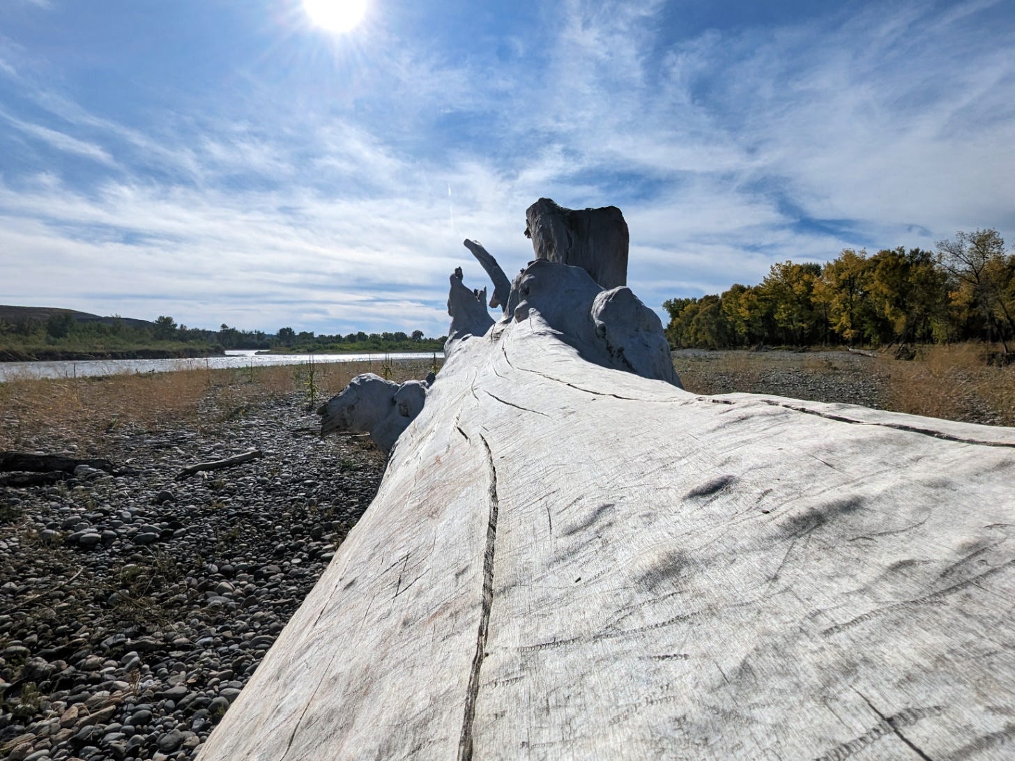 On that river walk, I collected smooth pebbles, tumbled all the way down from the mountains to the plains, listened to the particular voice of icy cold water, and explored the huge, bleached white body of a cottonwood tree stranded on a sandbar. It reminded me of whale bones sometimes discovered on beaches. Maybe the cottonwood is the whale of the river, its spirit mixed into the water and air now. Its remains beached on the prairie. I also spent time looking in the far distance, which is so healing for the eyes, and easy to do in Montana where there’s still not too much to block our sight lines.